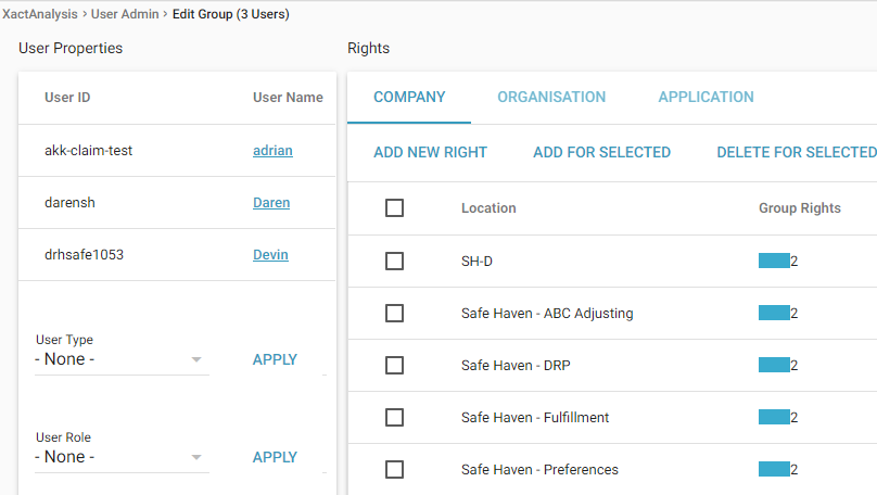 If you selected multiple users to edit, the Edit Group page appears. The User Group table shows the name and user ID for all the users you selected to edit. You also see the number of selected users with each right.- To add rights for all the selected users, select the check boxes of the rights you would like to add and click Add for selected. A confirmation dialogue box appears. Click OK.