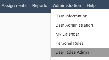 - Select User Roles Admin from the Administration menu.You must have the User Roles Admin application right to access User Roles Admin. See Add Users for information about adding rights.