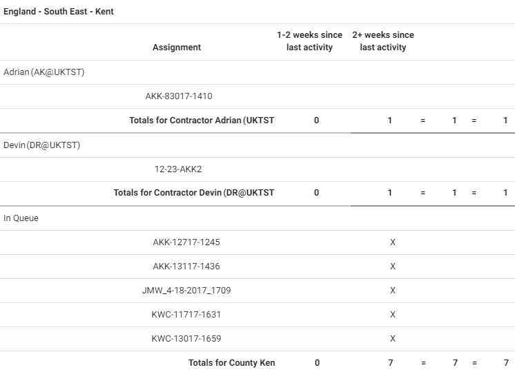 This report displays information about assignments with 1–2 weeks and 2+ weeks of inactivity, by area, adjuster/contractor, and claim reference. Inactive assignments have not been returned to XactAnalysis, cancelled, or rejected. This information helps to make you aware of adjusters/contractors with ageing assignments. Assignments are removed when they are returned, cancelled, or rejected.