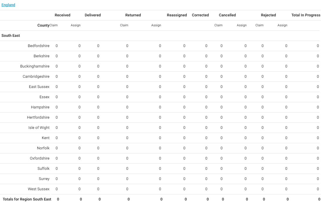 This report displays the statuses assignments receive during the report’s date range by region / office level. It further separates the assignment totals for some of the statuses by those with duplicate claim references and those without duplicate claim references. This report helps you track assignment activity volume by geographic/organisational area.