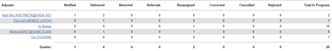 This report displays assignment statuses. If an assignment progressed through multiple statuses during the date range of the report, the report would count each of the statuses. For example, if an adjuster/contractor was notified about an assignment, the assignment was downloaded by the adjuster/contractor, and the estimate was uploaded to XactAnalysis during the report’s date range, the report would show a count for Notified, Delivered, and Returned.