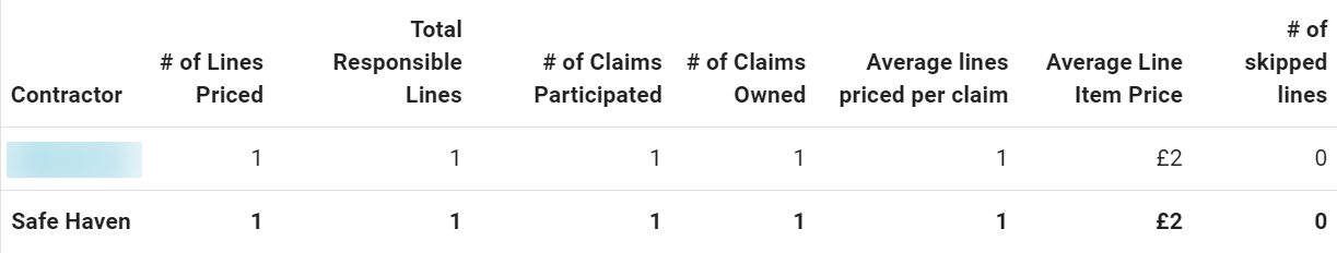 This report displays the number of contents line items priced by each adjuster or contractor (initial assignee or collaborator), the number of line items for which each adjuster or contractor is responsible, and the number of claims participated by each adjuster or contractor. It also shows the average number of line items per claim as well as the average price per line item and the number of skipped lines. This report helps you monitor the cost of line items added to estimates by each adjuster or contractor.