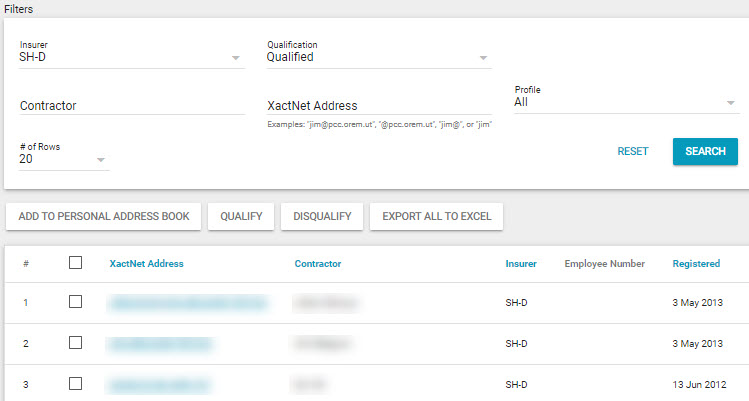 In the XactNet® Address Book you can view and sort the list of assignees (adjusters/contractors) available to your company. The XactNet Address Book also includes other useful information about each assignee, including their Xactimate® version currently in use, date and time last connected, and qualification status.
