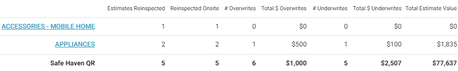 This report displays the number and value of overwrites and underwrites reported during the reinspection process for each price list category. Only the most current completed reinspection for each estimate is included in the report.