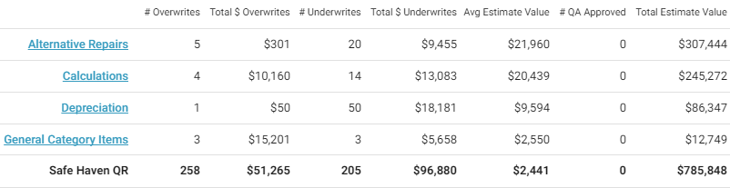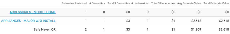 This report displays the number and value of overwrites and underwrites reported during the claim review process for each price list category. Only the most current completed claim review for each estimate is included in the report.