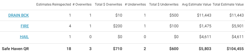 This report displays the number and value of overwrites and underwrites reported during the reinspection process for each cause of loss. Only the most current completed reinspection for each estimate is included in the report.