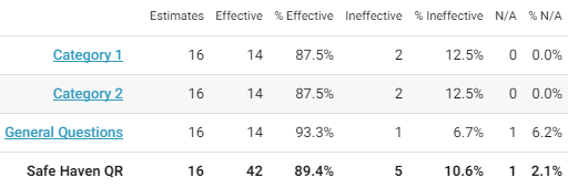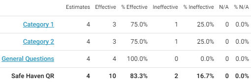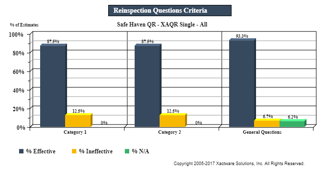 This report displays the percentage of estimates categorized as Effective, Ineffective, or N/A for each category on the Reinspection Form. Only the most current completed reinspection for each estimate is included in the report.