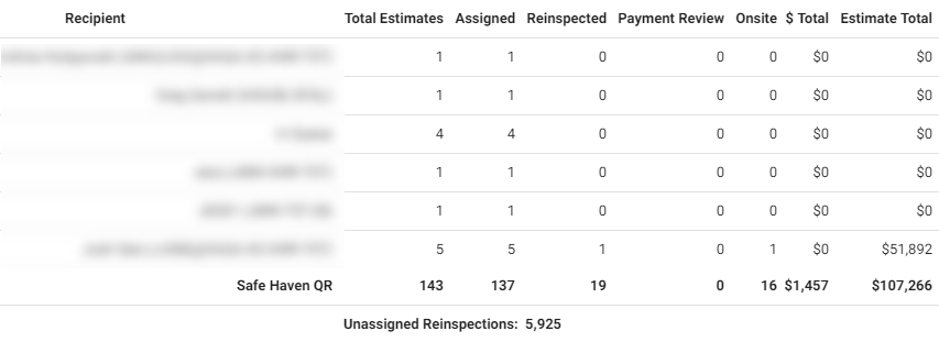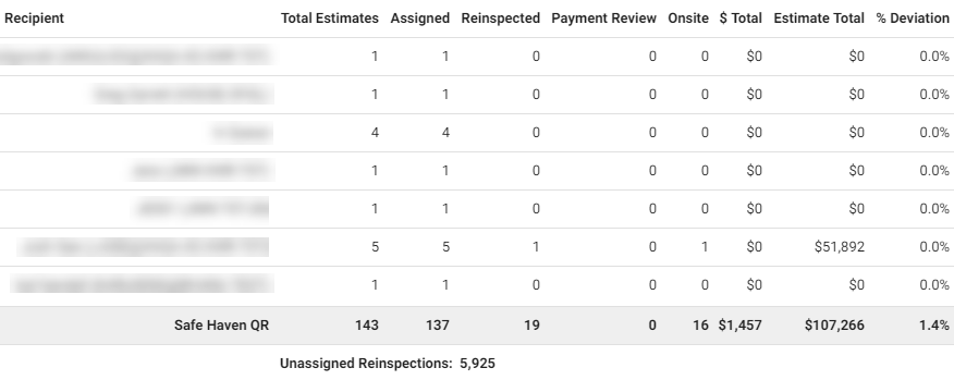 This report displays the reinspection activity for original recipients’ estimates, and calculates reinspection activity totals for a data set. Only the most current completed reinspection for each estimate is included in the report.