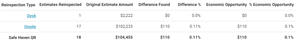 This report compares onsite reinspections with desk reinspections, helping you see the effectiveness of each. Only the most current completed reinspection for each estimate is included in the report.