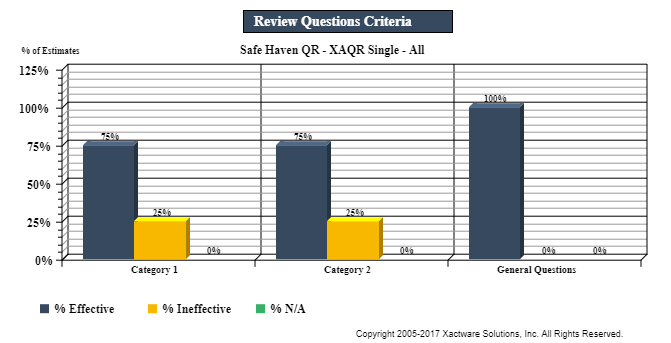 This report displays the percentage of estimates categorized as Effective, Ineffective, or N/A for each category on the Claim Review Form. Only the most current completed claim review for each estimate is included in the report.