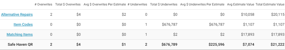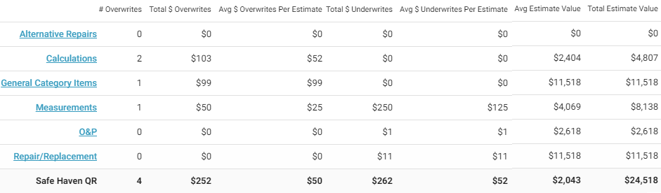 Avg $ Overwrites Per Estimate: Average value of overwrites per estimate (Total $ Overwrites / Estimates Reinspected)