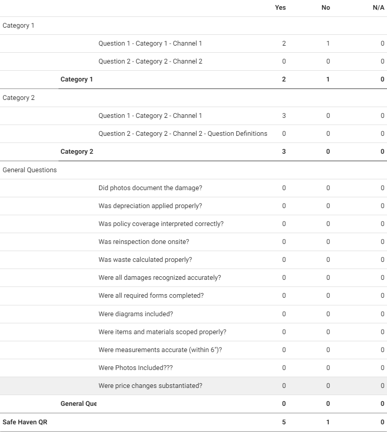 This report displays the reinspection form questions by the adjuster who originally wrote the estimate. It shows the total number of Yes, No, and Not Applicable responses to each question on the reinspection form. This enables you to determine how your adjusters are evaluated by reinspectors and find areas for improvement. Only the most current completed reinspection for each estimate is included in the report.