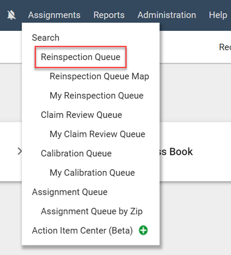 - Select Reinspection Queue from the Assignments menu. To see only reinspections assigned to you, select My Reinspection Queue.