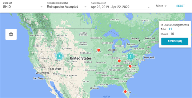The Reinspection Queue Map displays the geographic locations of reinspections in the Reinspection Queue and allows administrators to select reinspections and assign them to a reinspector.