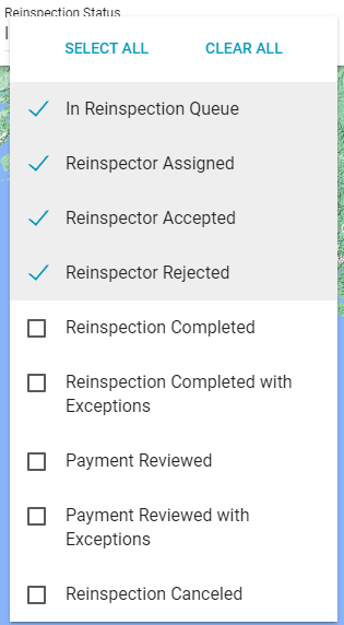 - Use the Reinspection Status filter in Search to find assignments with specific reinspection statuses.