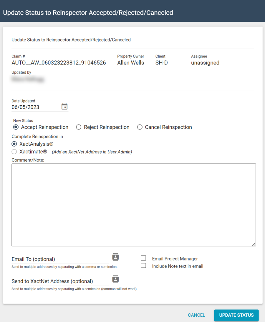 - Under Complete Reinspection in, select XactAnalysis if you want to complete the reinspections in XactAnalysis QR or Xactimate if you want to complete the reinspections in Xactimate.