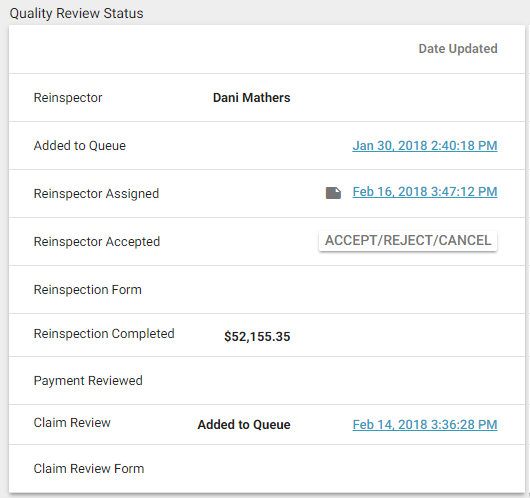 - In the Quality Review Status section of the Details tab, go to the Reinspector Accepted line and select Accept/Reject/Cancel.