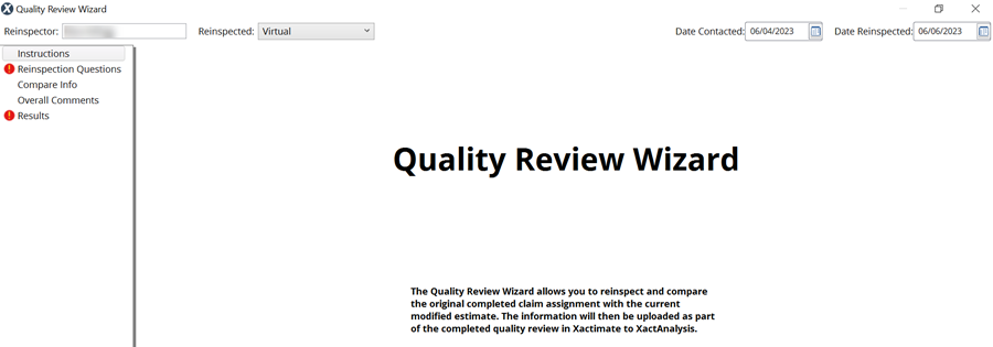 - In the Quality Review Wizard section, select Mark in review. This is the Xactimate version of the Reinspection Evaluation Form. The Quality Review Wizard opens to the Instructions page.