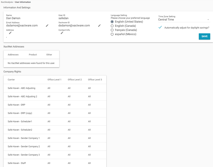In User Information, you can view the following information about your XactAnalysis® Quality Review (QR) account: name, user ID, Xactware ID, profile picture, email address, user rights, XactNet addresses, and language settings. You can manage your Xactware ID information, profile picture, email address, password, and default language settings. To update your name, user ID, user rights, and add XactNet Addresses go to User Administration.