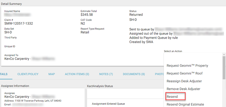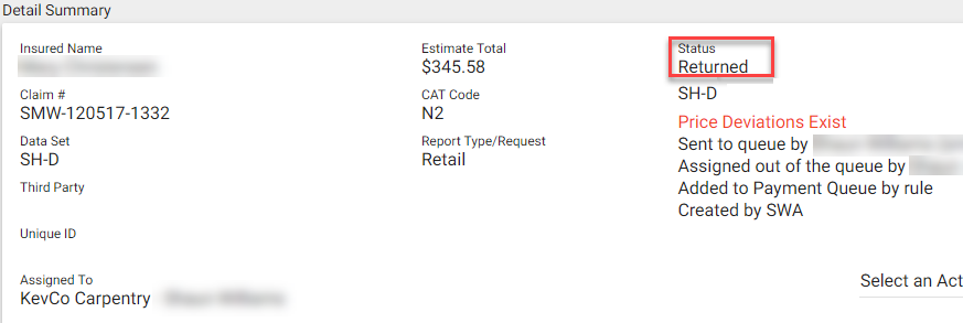 - The assignment has not been assigned to an adjuster/contractor. It has a status of In Queue. View the status in the Detail Summary.