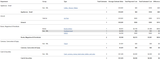 - Select a link in the Type of Loss column to see data for your hierarchy levels, including individual estimates.