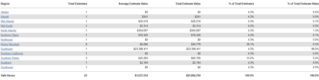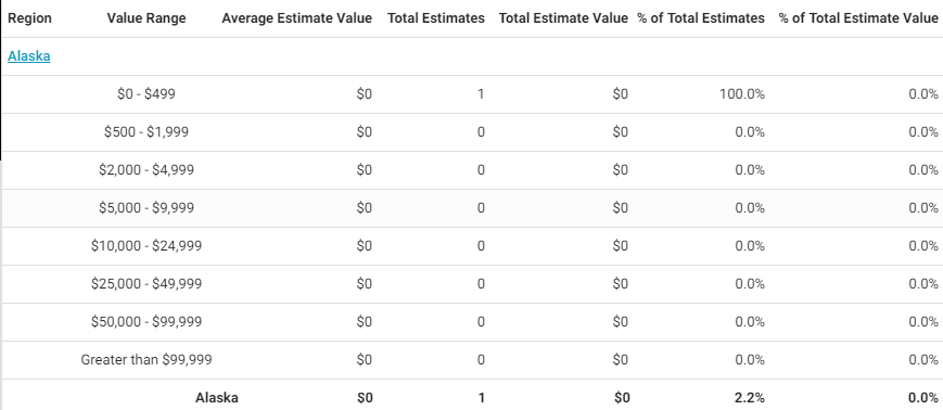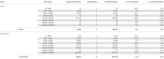 This report displays estimate information by value range and region / office level, helping you track estimates by value range.