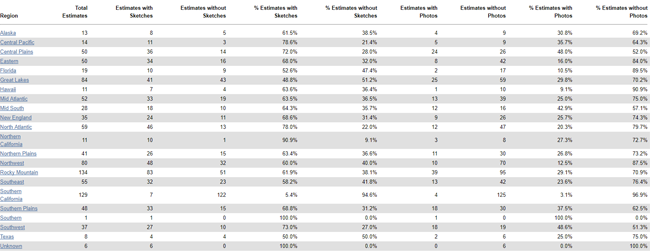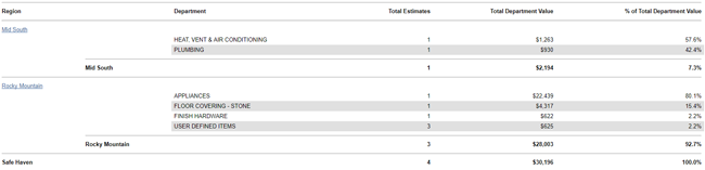 This report displays the number of estimates in each region / office level, their value, and their average value. This information helps you see geographic/organizational trends in estimate value.