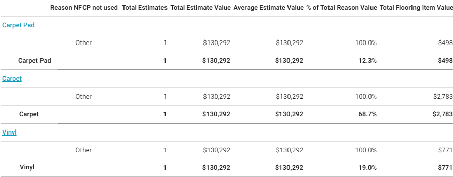 This report displays estimate information by flooring item, including reasons NFCP was not used. When an estimate uses NFCP, samples of flooring are sent to a third party vendor who sends back information about the flooring’s make and grade so the adjuster/contractor can install an exact match or arrive at an exact price. This report helps you track the reasons NFCP was not used.