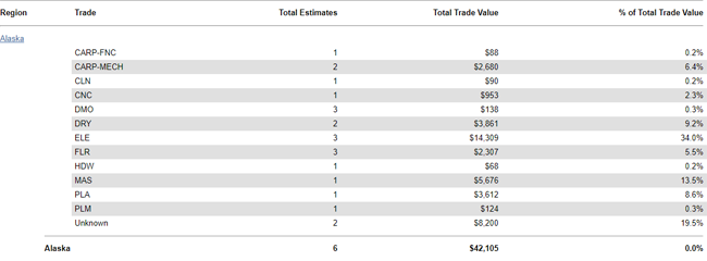This report displays each trade’s percentage of estimates’ total trade value (excluding O&P and tax). This helps you evaluate trade usage and value in your hierarchy.