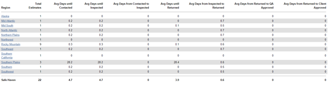 Avg Days from Inspected to Returned: Average number of days from status Site Inspected (site inspected by assignment recipient) to Returned (estimate returned to XactAnalysis from assignee)