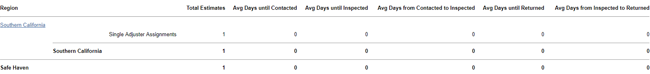 This report displays the last adjuster/contractor’s (the adjuster/contractor that last returned the estimate) response times for each step of the estimate process. The “start” time for the response time calculations is Assignment Received date. This report helps you monitor adjuster/contractor activity, specifically their timeliness in progressing assignments.