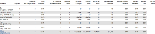 This report displays information about estimates where prices deviated from the price list prices. For example, a price obtained from a local source could differ from a price list price. This report helps you determine which adjusters/contractors are changing prices and the extent of the price changes.