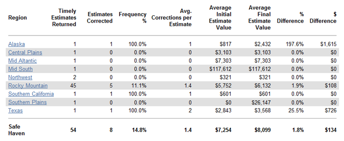 Average Audit Results: Average value per estimate of line items with errors found and corrections made (Total Audit Results / Estimates w/Inspection Results)