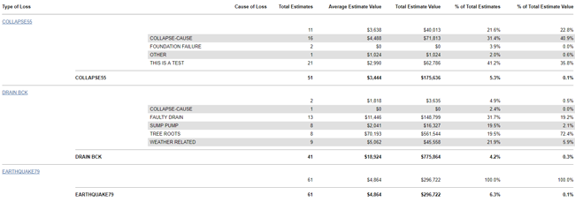 This report displays estimate information by type of loss, helping you see trends in type of loss costs.