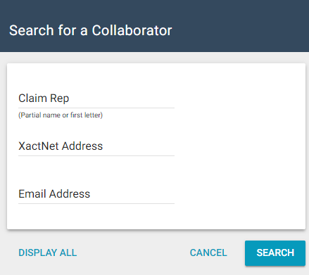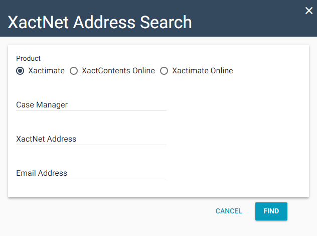 - In the XactNet Address Search dialog box, enter the name, XactNet address, or email address of a claim rep/adjuster, and click Find. Click Cancel to exit without searching.