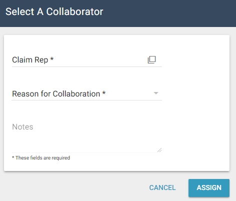 - The name appears in the Claim Rep field in the Select a Collaborator dialog box. Enter a reason for this collaboration in the Reason for Collaboration field and click Submit.
