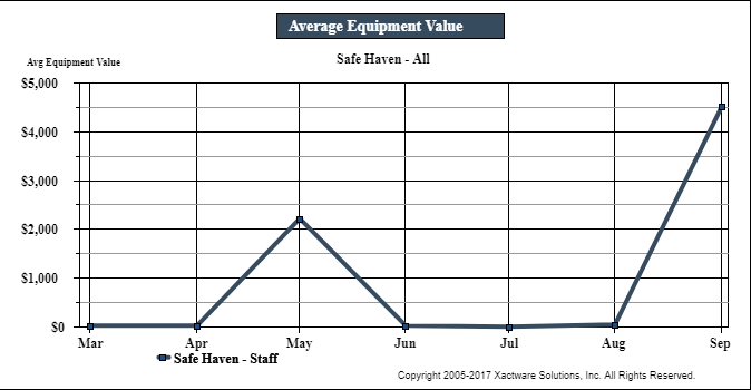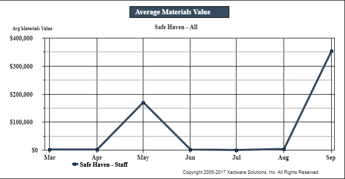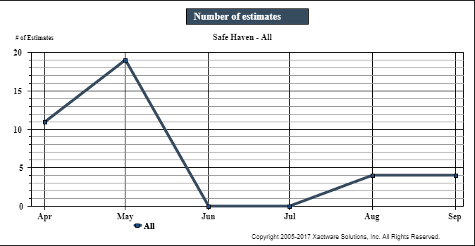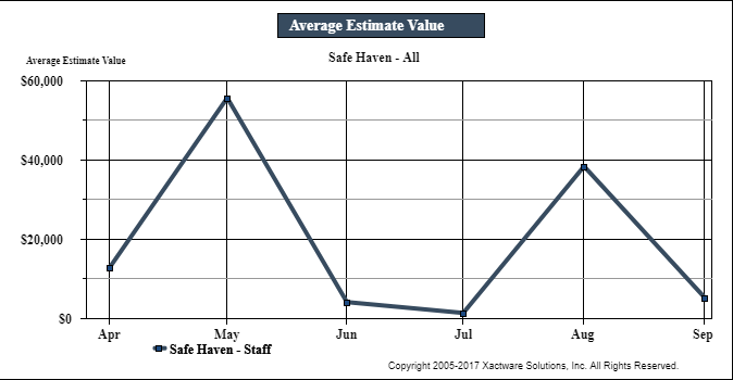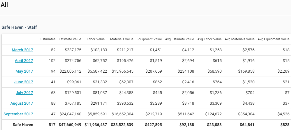 This report displays the average estimate value, labor value, materials value, and equipment value by month for a 6–13 month period. This report can help you track seasonal trends in estimate costs.