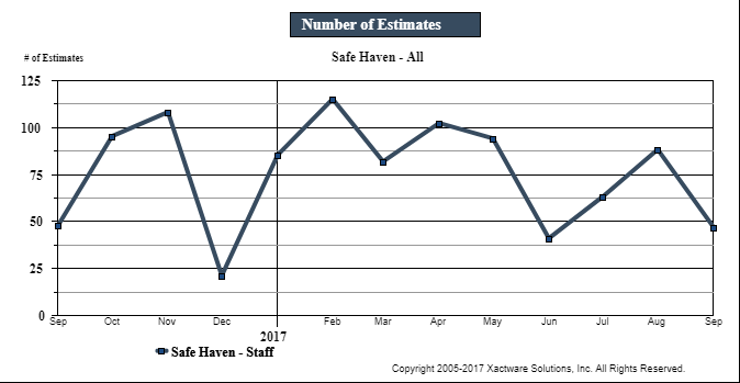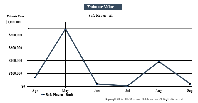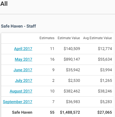 This report displays the estimate volume, total estimate value, and average estimate value by month for a 6–13 month period. This report helps you track trends in estimate volume and value.