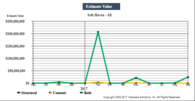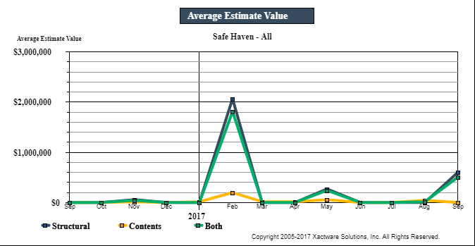 This report presents contents estimate volume, total value, and average value by month for a 6–13 month period. This report helps you track seasonal trends in contents estimate volume and value.