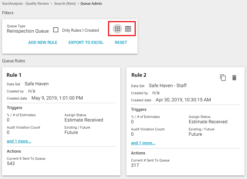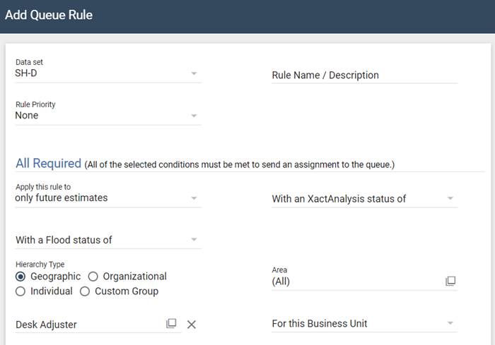 The Queue Admin page allows you to add, edit, and delete rules for the Estimate Review Queue.