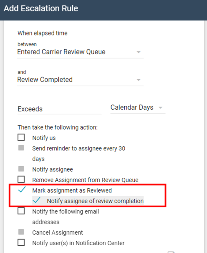 You can now create program rules that automatically mark assignments as Reviewed if they exceed a specified limit. To enable this, create or edit a program rule and select the new Mark assignment as Reviewed check box. When this check box is selected, you can also select a Notify assignee of review completion check box to notify the assignee when the rule is triggered.