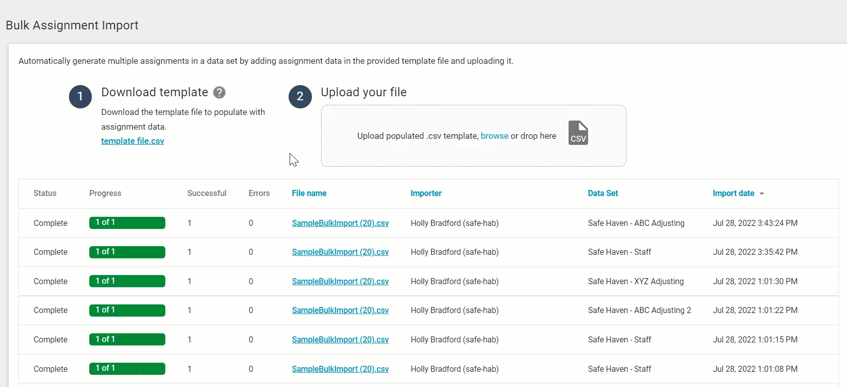 You can now sort the File Name, Importer, Data set, and Import Date columns in the Bulk Assignment Import table! Just click the header name, and the table will update automatically.