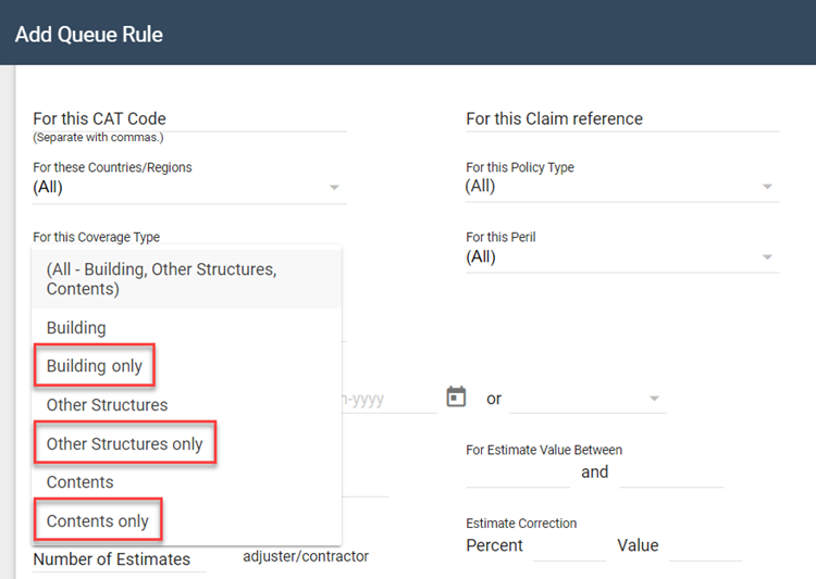 We added three new options to the For this coverage type dropdown menu in Queue Admin’s Add Queue Rule window: structural only, other structures only, and contents only. These new options allow you to easily identify uploaded estimates that only have line items marked with the associated coverage type.