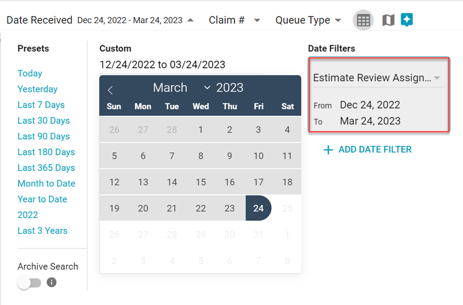 We added an Estimate Review Assigned Date option to the Date Filters list in Search.