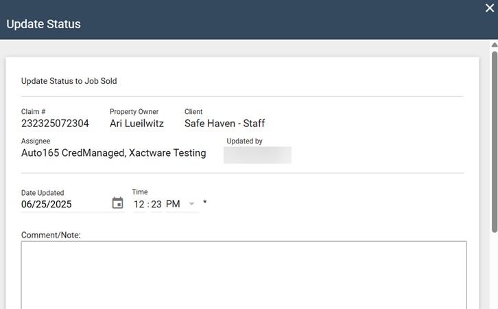 - The comments entered when setting the Job Not Sold and Adjuster Notified of Cancellation statuses are now always displayed in the View Status dialog, regardless of whether the status is set via EDI or manually in XactAnalysis.