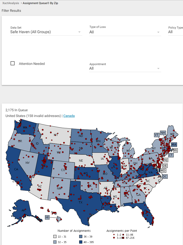 - The Filter Results area enables you to filter assignments by data set, type of loss, policy type, job type, CAT/non-CAT, attention needed, and appointment.