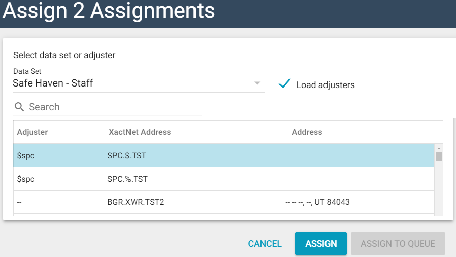 - To assign assignments to an adjuster or contractor in the current data set, click the Load adjusters check box. Click an adjuster. Click Assign.
