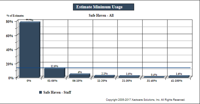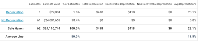 This report displays the percentage and number of estimates that had either depreciation or no depreciation applied to line items in Xactimate®, helping you observe how depreciation affects the value of estimates.
