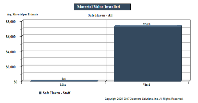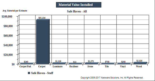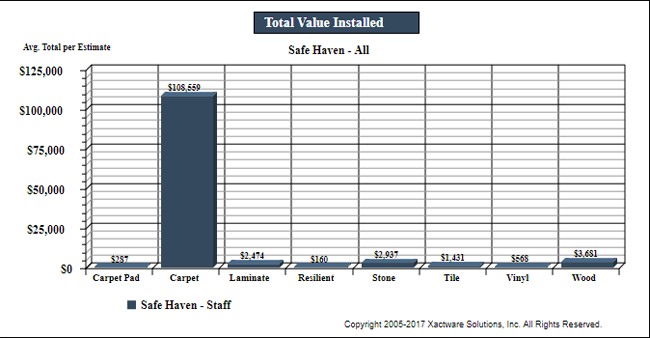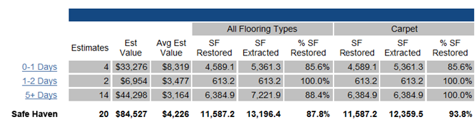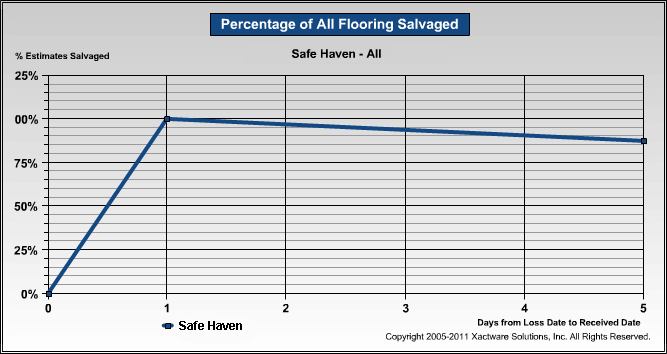 This report displays the percentage and value of flooring (carpet, tile, vinyl and wood) that was salvaged, by the number of days it took to receive the job. The restored percentage is derived from information entered for each water extraction item in Xactimate. This report helps you see the correlation between time and the value of flooring that can be salvaged in a flood situation.