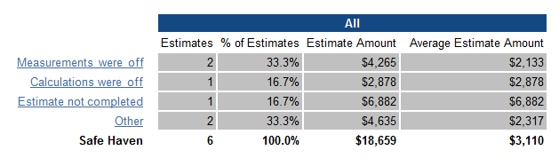 When developing an estimate for an older home, sometimes additional work or materials may be required to bring the home up to current building codes. Code Upgrade refers to line items that had to be added to an estimate to bring a building up to code. This report displays the additional costs associated with estimates that require code upgrades.
